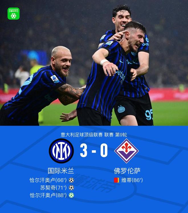 北京时间10月30日意大利足球顶级联赛 联赛 第9轮,国际米兰主场对阵佛罗伦萨。国际米兰恰尔汗奥卢梅开二度,苏契奇破门。最终比分国际米兰 3-0 佛罗伦萨。